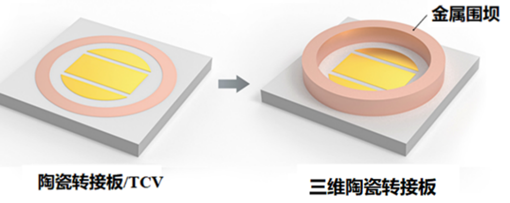 为满足深紫外LED、VCSEL激光器、高频晶振等器件气密封装需求,公司在平面陶瓷转接板(TCV)基础上,开发了含围坝结构的三维陶瓷转接板(3D-TCV)。三维陶瓷基板具有图形精度高、低温制备,成本低等优势,已广泛用于深紫外LED消毒、手机人脸识别、高频晶振、高端传感器(如加速度计、陀螺仪等)气密封装(部分取代 HTCC/LTCC陶瓷基板)。