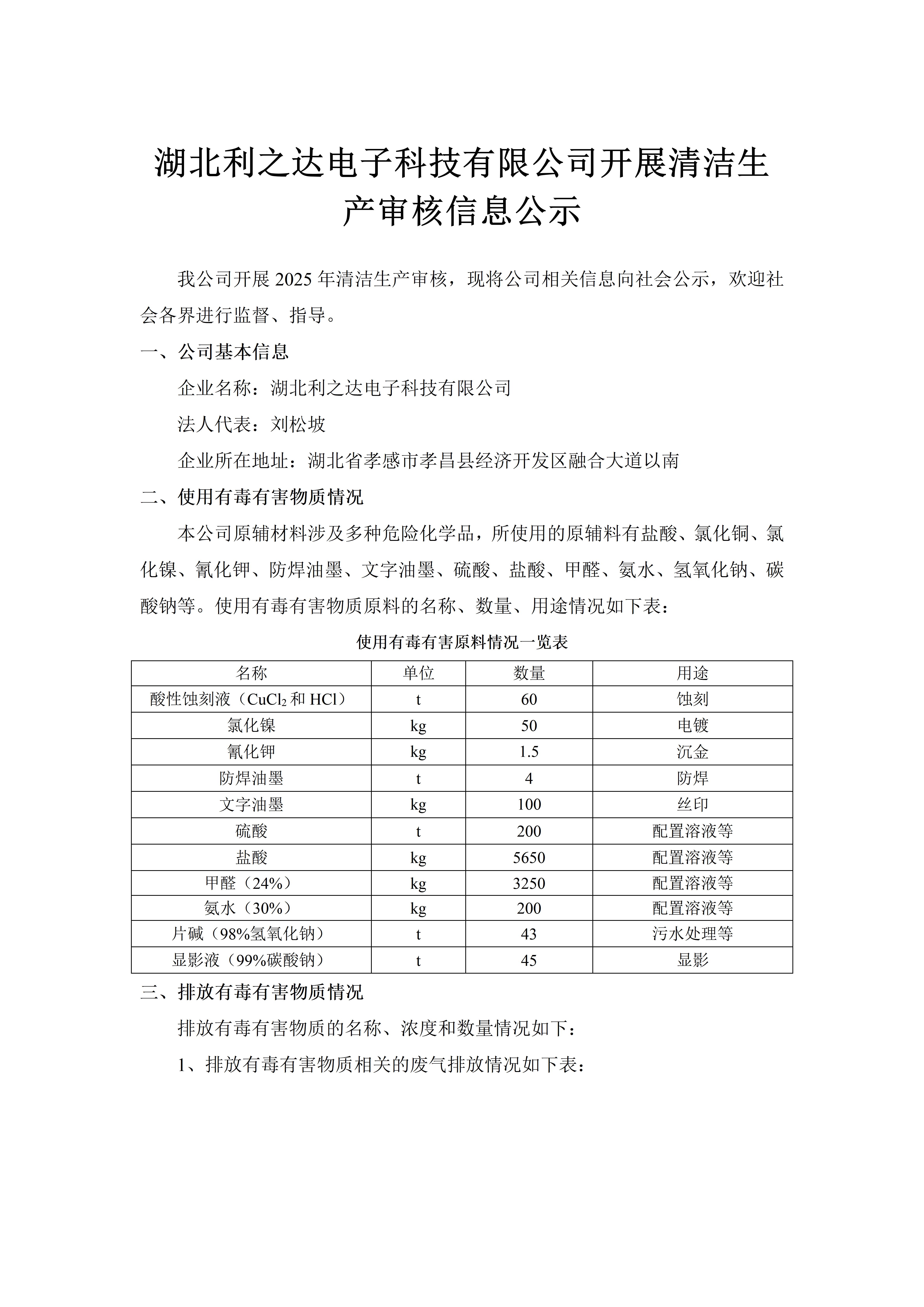 湖北利之达电子科技有限公司开展清洁生产审核信息公示